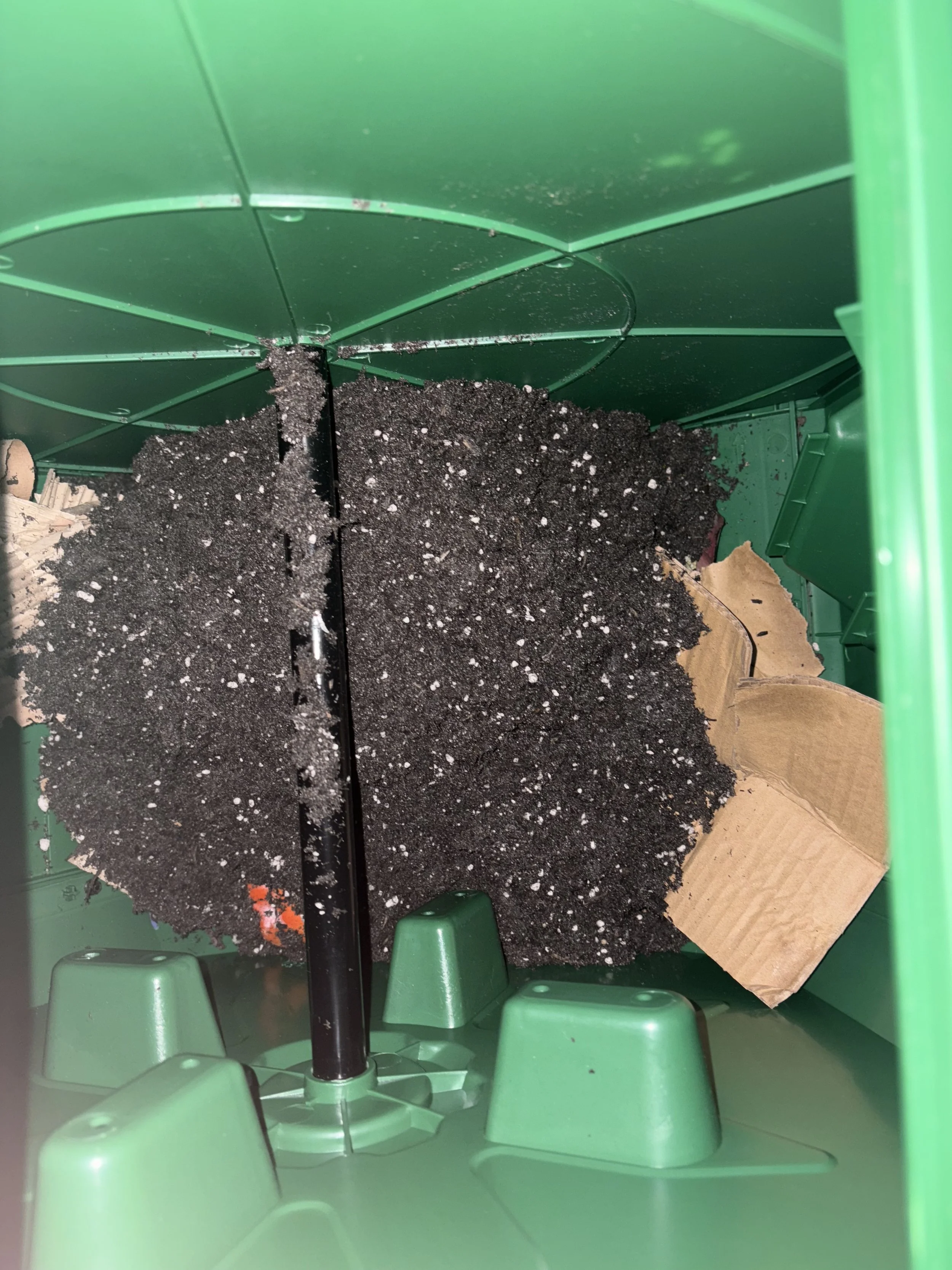 The first part of my compost process was the turn barrel. I started by putting twigs at the bottom of the barrel for airflow. Then I layered my browns for carbon and greens for nitrogen in. I used leftover cardboard and old fruit and veggies respectively for this. I then layered the barrel with soil on top to cover odor and watered and sealed the barrel. Then I sealed the barrel off and turned it around 10 times to mix it around. The barrel already had air vents for air flow so no holes were needed. I will continue doing this process for a month until I noticed significant change.